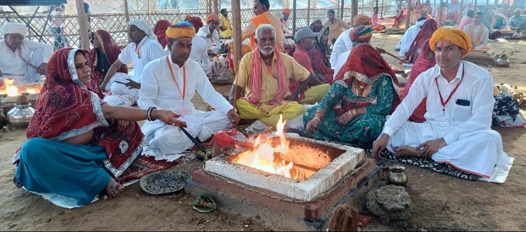 श्रीमाधोपुर (नवयत्न)। कालाकोटा के 700 वर्षों के प्राचीनतम दाऊधाम में परमपूज्य अनंत विभूषित श्रीमद् जगतगुरु बाहुबल द्वाराचार्य पीठाधीश्वर बलदेवाचार्य महाराज संत के सानिध्य एवं भोलाशंकर महाराज एवं विनोद दास महाराज के कुशल निर्देशन में चल रहे 108 कुण्डात्मक श्री गोपाल गौपुष्टि महायज्ञ के दूसरे दिन श्रद्धालुओं एवं भक्तगणों का जन सैलाब उमड़ पड़ा।श्रद्धालुओं ने यज्ञ भगवान की परिक्रमा लगाकर आशीर्वाद लिया तथा सुख,समृद्धि, खुशहाली की कामना की । यज्ञाचार्य पं. चिरंजीवी शास्त्री के आचार्यत्व में यजमान जोड़ो ने 7 लाख 11 हजार आहुतियां दी । प्रधान कुंड पर संत बलदेव दास महाराज, वृंदावन के श्रीजी महाराज, विनोद दास महाराज, भोलाशंकर दास महाराज, पूर्व मंत्री राजेंद्र सिंह गुढ़ा, डॉ.मंगल यादव, मोनिका यादव ने आहुतियां दी । वृंदावन के श्री जी महाराज ने श्रीकृष्ण भगवान की लीला के बारे में तथा राधा रानी के भाव के बारे में बताया । उन्होंने बृज भाषा में राधा -रानी का भजन सुनाकर यजमान जोड़ों को आशीर्वाद दिया ।