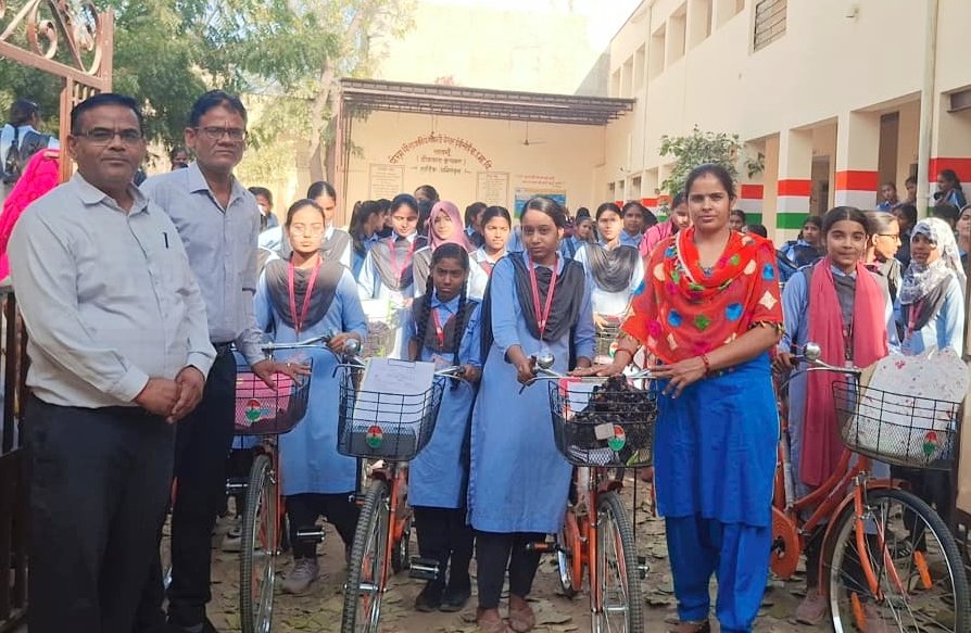 लाडनूं (नवयत्न ) । स्थानीय पीएम श्री केसरदेवी बालिका उच्च माध्यमिक विद्यालय लाडनूं की बालिकाओं को संस्था प्रधान विजय सिंह चौहान की अध्यक्षता में साइकिल वितरण कार्यक्रम का आयोजन किया गया। प्रभारी शिव शंकर बोहरा ने बताया की राज्य सरकार द्वारा सरकारी विद्यालयों में बालिकाओं को दी जाने वाली सुविधाओं में साइकिल वितरण योजना मुख्य सुविधा है जो दूर दराज की बालिकाओं को सरकारी विद्यालय से जोड़ने में मुख्य भूमिका निभाती है। इससे शहरी क्षेत्र में 3-4 किलोमीटर दूर से स्कूल आने वाली बालिकाओं को आवागमन में सुविधा रहती है। विद्यालय की 85 बालिकाओं को साइकिल वितरित की गईं। इस अवसर पर व्याख्याता परमेश्वरी, शशि शर्मा, प्रेमलता, सरोज बाला, पूनम चौधरी, शंकर लाल, दयाराम, आकिब जावेद रीना शर्मा, रामगोपाल सहित अभिभावक सलमा बानो, मो.साबिर, जुबेदा, मो आरिफ सहित एसडीएमसी सदस्य मोहम्मद इसहाक छींपा, मास्टर जलालुद्दीन आदि उपस्थित रहे। वहीं साईकिल पाकर बालिकाओं के चेहरे खिले हुए नजर आए।