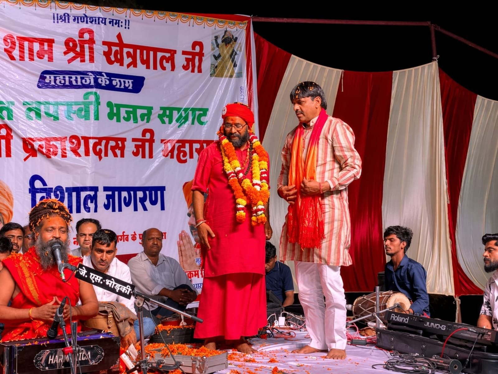 बुगाला (नवयत्न) । गांव सौंथली में महाराज खेत्रपाल के जन्मोत्सव पर मंदिर परिसर में आयोजित भजन संध्या में संत प्रकाश दास ने मधुर भजनों की प्रस्तुति देकर श्रद्धालुओं को भाव-विभोर कर दिया। “बिणजारी ए हंस-हंस बोल…” जैसे अनेक लोकप्रिय भजनों पर पूरा पंडाल भक्ति रस में सराबोर नजर आया।