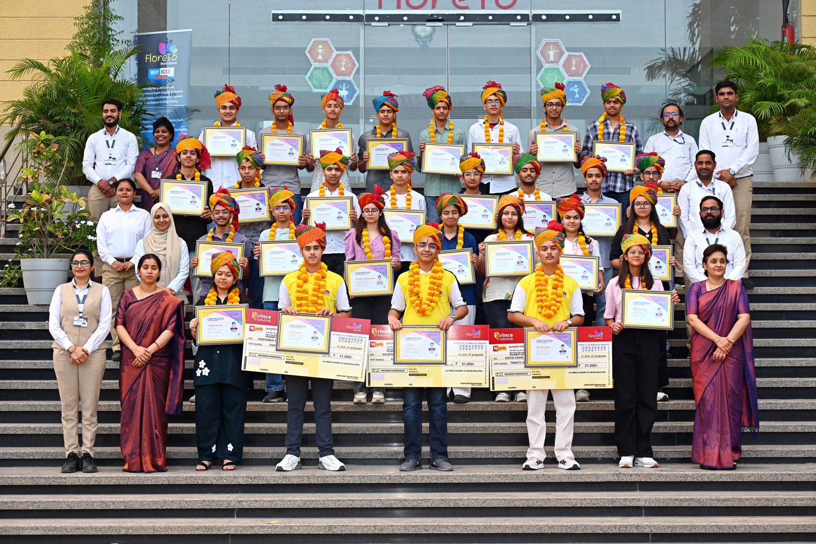 शानदार परीक्षा परिणाम से फ्लोरेटो कैम्पस में जश्न का माहौल रहा। प्रिंस एजुहब चेयरमैन डा. पीयूष सुण्डा, मुख्य प्रबंध निदेशक राजेश ढिल्लन, ब्रिगेडियर आर.के. बवलदा, प्रबंध निदेशिका डा. मिनाली सुण्डा एवं प्रिंसिपल रिंकू शर्मा ने उत्कृष्ट अंक प्राप्त विद्यार्थियों का माल्यार्पण, साफा पहनाकर एवं स्मृति चिन्ह देकर अभिभावकों सहित सम्मान किया। टाॅपर तीन विद्यार्थियों को क्रमशः 51 हजार, 31 हजार एवं 11 हजार रू. का नकद पुरस्कार भी दिया गया है।