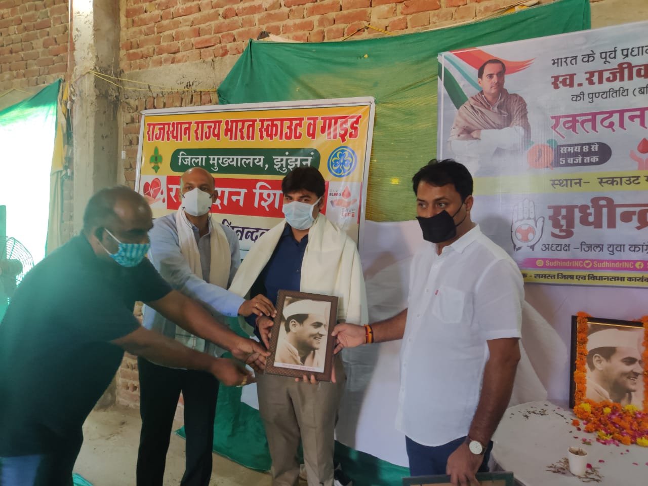 झुंझुनूं,(जय जांगिड़)21 मई। पूर्व प्रधानमंत्री भारत रत्न स्वर्गीय राजीव गाँधी की पुण्यतिथि (बलिदान दिवस) पर यूथ कांग्रेस झुंझुनूं के द्वारा कोरोना फाइटर्स को समर्पित स्वैच्छिक रक्तदान शिविर का आयोजन किया गया। जिला मुख्यालय स्थित राजस्थान राज्य भारत स्काउट व गाइड के परिसर में सुबह 8:30 बजे भारत रत्न राजीव गाँधी की प्रतिमा पर महिला कांग्रेस जिलाध्यक्ष बिमला बेनीवाल, जिला उपभोक्ता विवाद प्रतितोष मंच के सदस्य मनोज मील, प्रमुख चिकित्सा एवं स्वास्थ्य अधिकारी डॉ छोटेलाल गुर्जर, डॉ राजकुमार डांगी, राजकीय बीडीके अस्पताल के पीएमओं डॉ शुभकरण कालेर एवं यूथ कांग्रेस जिलाध्यक्ष सुधीन्द्र मूंड के द्वारा पुष्पांजलि अर्पित कर शुभारम्भ किया गया।