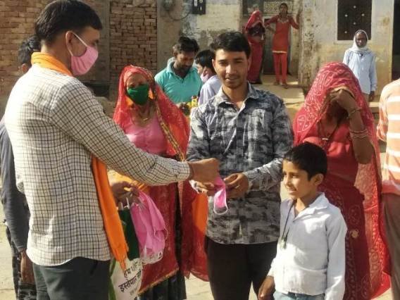 राधेश्याम शर्मा ने बताया कि वह स्वयं के खर्चे पर कपड़े के मास्क सीलवाकर पीएनबी बैंक कांवट, ग्राम भादवाड़ी व बालवाड़ में कोरोना महामारी के प्रति लोगों में जागरूकता पैदा कर मुंह पर मास्क लगाकर घर पर सुरक्षित रहने के लिए प्रेरित किया है। उन्होंने बताया कि यह प्रेरणा मोदीजी से व भाजपा संगठन से मिली जिन्होंने मुझे कोरोना के प्रति लड़ने की जागरूकता पैदा हुई।