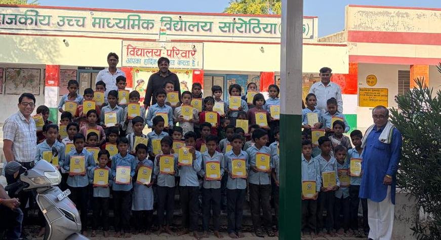 राजकीय विद्यालय में विद्यार्थियों को अभ्यास पुस्तिकाएं वितरित