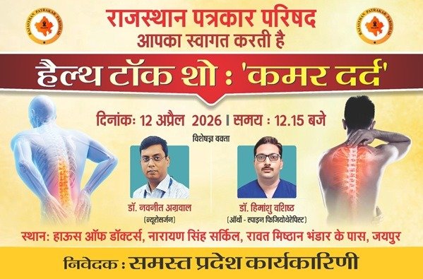 जयपुर (नवयत्न)। राजस्थान पत्रकार परिषद द्वारा समस्त पत्रकारों के हैल्थ टॉक शो के साथ स्वास्थ्य शिविर का आयोजन किया जा रहा है इसके बारे में जानकारी देते हुए वरिष्ठ पत्रकार रोहित सोनी ने बताया कि शहर के नामचीन चिकित्सक डॉ नवनीत अग्रवाल न्युरोसर्ज और डॉ हिमांशु वशिष्ठ अर्थों : स्पाइन फिजियोथैरेपिस्ट अपनी विशेष सेवाओं के साथ आम लोगों में भागतीं दौड़ती जिंदगी में बढ़ती “कमरदर्द”की परेशानी के कारणों और बचाव के बारे में सभी को ज्ञानवर्धक जानकारी प्रदान करने के साथ बचाव के उपाय भी बताएंगे इस आयोजन में ज्यादा से ज्यादा पत्रकार पहुंचे और लाभ उठाकर लाभान्वित हो