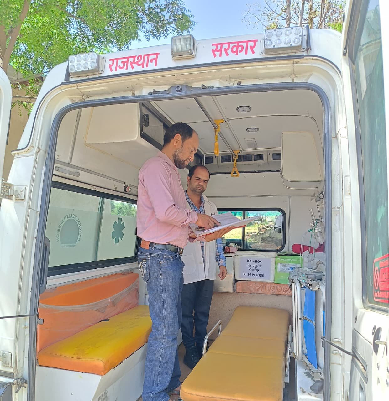 श्रीमाधोपुर (नवयत्न) । समस्त मुख्य चिकित्सा एवं स्वास्थ्य अधिकारी गण हीट वेव तापमान को देखते हुए 18 से 19 अप्रैल, 2026 के बीच सभी 108 एम्बुलेंस और ममता एक्सप्रेस वाहनों का निरीक्षण कर रहे हैं।निरीक्षण में एयर कंडीशनिंग की कार्यक्षमता, आइस बॉक्स , दवाओं की उपलब्धता, ऑक्सीजन सिलेंडर और जैव-चिकित्सा अपशिष्ट प्रबंधन पर ध्यान केंद्रित किया गया है।जिला नोडल अधिकारी रवि प्रकाश सैनी और ब्लॉक कार्यक्रम प्रबंधक ने श्रीमाधोपुर एम्बुलेंस का निरीक्षण किया एंबुलेंस सेवा में संचालित सभी प्रकार की सुविधाओं की जानकारी ली गई ।इस मौके पर नर्सिंग ऑफिसर हेमंत कुमार सैनी और पायलट संजय सिंह मौजूद रहे।