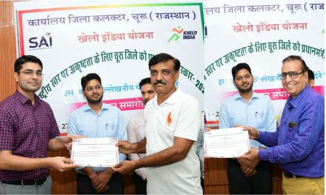 रतनगढ़ (नवरतन वर्मा)। जिला कलेक्टर चूरू सिद्धार्थ सिहाग द्वारा खेलो इंडिया योजना अंतर्गत खेल क्षेत्र में उल्लेखनीय योगदान पर नगर के खेल प्रशिक्षक अशोक कुमार गौड़ व राजेश गहलोत को प्रशस्ति पत्र प्रदान किया गया है। खेल प्रशिक्षक अशोक कुमार गौड़ को श्री हनुमान व्यायामशाला में शूटिंग बॉल व राजेश गहलोत को श्री गांधी बाल निकेतन में संचालित डॉण्बी पी सराफ इंडोर स्पोटस कॉम्प्लेक्स में टेबल टेनिस खेल में सतत उत्कृष्ट योगदान के लिए प्रधानमंत्री पुरस्कार 2021 के अंतर्गत प्रशस्ति पत्र प्रदान किया गया है ।