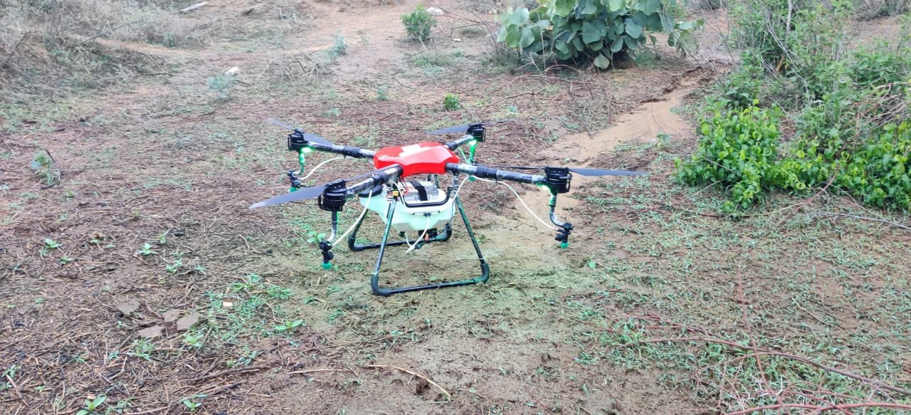 कीटनाशक छिड़काव के लिए किया ड्रोन का उपयोग