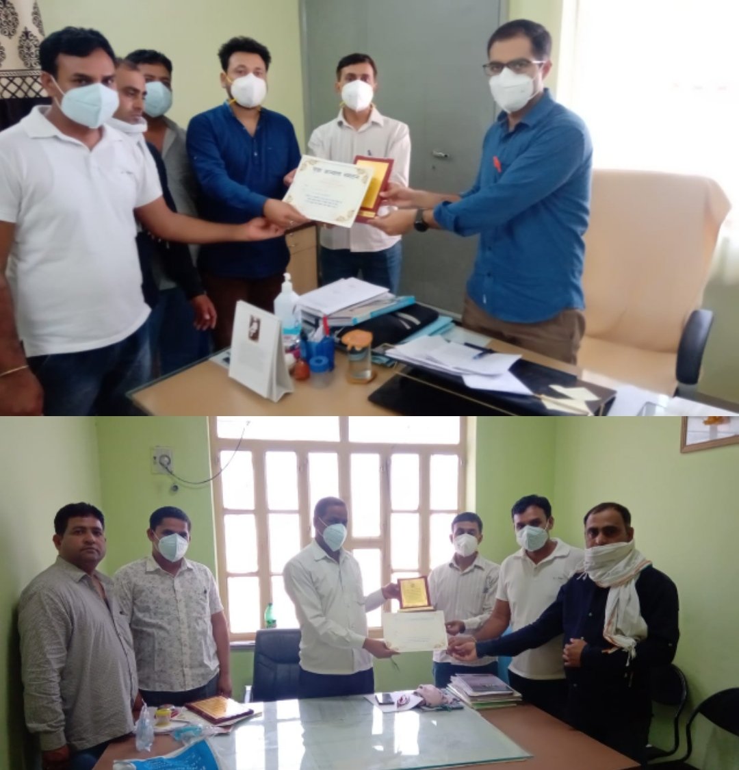 मलसीसर,(रमेश शर्मा)28 मई। युवा कल्याण संगठन के प्रदेश अध्यक्ष देशमुख दादरवाल ने आज कोविड 19 के प्रति लोगों को जागरूक करने तथा लॉकडॉउन की पूरी तरह से पालन करवाने के लिए SDM Dr. अमित यादव व तहसीलदार जगदीश प्रसाद मीणा को सम्मानित किया। जानकारी देते हुए संगठन के अध्यक्ष ने बताया कि संगठन द्वारा कोविड-19 के दौरान सराहनीय कार्य करने व पूरे उपखंड क्षेत्र में कोविड -19 के प्रति लोगों को जागरूक किया बल्कि लॉकडॉउन की पूरी तरह से पालना सुनिश्चित करवाने में भी महत्वपूर्ण भूमिका निभाई। संगठन की तरफ से SDM व तहसीलदार को एक स्म्रति चिन्ह व प्रशंसा पत्र दिया गया। इस अवसर पर कालू सिंह राठौड़, मोहित दादरवाल, सुरेन्द्र टीटानी, सुमित भट्ट, संजय जितवानबास आदि मौजूद थे।