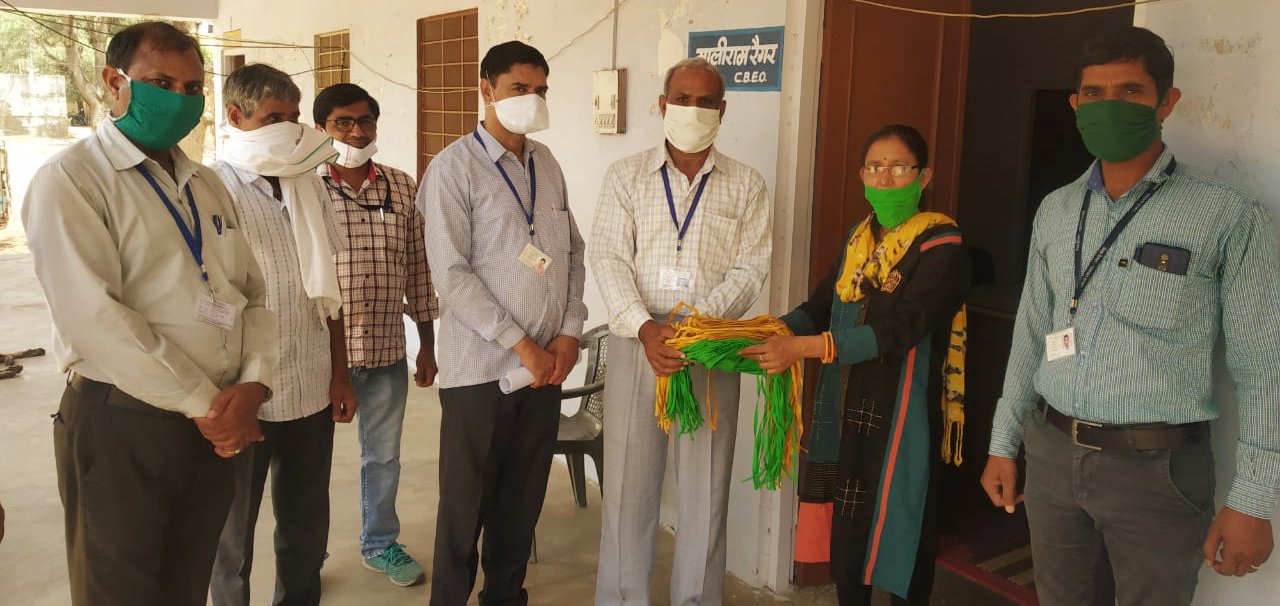 श्रीमाधोपुर,(महेन्द्र खडोलिया)15 मई। कोरोना के खिलाफ जंग में शिक्षा विभाग के कार्मिक पूरे दमखम से मैदान में डटे हुए हैं। वहीं शिक्षिका तारा देवी गढ़वाल ने मुख्य ब्लॉक शिक्षा अधिकारी कार्यालय में जरूरतमंदों के लिए 50 मास्क भेंट किए। शिक्षिका ने बताया कि अपने हाथों से सिलकर अभी तक 500 मास्क क्षेत्र में बांट चुकी हैं और आगे भी ये कार्य जारी रखेगी। मुख्य ब्लॉक शिक्षा अधिकारी मालीराम रैगर ने शिक्षिका का इस कार्य के लिए उत्साहवर्धन किया। इस अवसर पर एसीबीईओं विनोद कुमार शर्मा, रामजीलाल सैनी, कजोड़मल बुनकर, राधेश्याम स्वामी, फूलसिंह, घासीराम सैनी, मनोज कुमावत सहित स्टाफ सदस्य मौजूद थे।