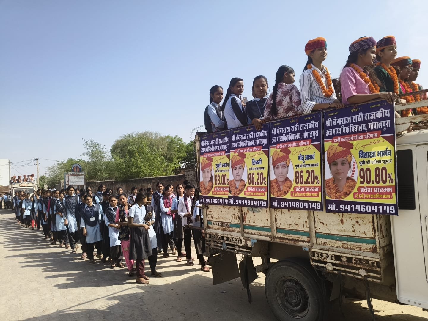 सुजानगढ़ (नवययन) । निकटवर्ती ग्राम पंचायत गोपालपुरा में श्री बेगराज राठी उ मा विद्यालय के नेतृत्व में प्रवेशोत्सव कार्यक्रम के अंतर्गत प्रतिभाशाली छात्र छात्राओं को साफा एवं माला के साथ सम्मानित किया गया। बेगराज राठी स्कूल के साथ ही महात्मा गांधी रा वि एवं राजकुमार लाहोटी बालिका विद्यालय के विद्यार्थियों के साथ भव्य रैली निकाली गई। प्रशासक सविता राठी ने कहा कि शिक्षा वो प्रकाश है जिसकी रोशनी में पीढ़ियां अपनी राह चुनती हैं प्रिंसिपल केसरी सिंह, प्रिंसिपल भागीरथ गर्ग, व्याख्याता अजय, सत्यनारायण के सान्निध्य में लगभग 600 बच्चों ने नाचते गाते रैली में भाग लिया। विशाखा भार्गव, नीतू आचार्य, लिछमा, खुशी, रुचिका, रोशनी, कांता, निशा, अनुसुइया, अंकिता, रामचंद्र, मोनिका, आरुषि, भगवती, श्रावणी, दीपिका आदि प्रतिभाशाली बच्चों का ग्रामीणों ने स्वागत किया, जिनको राठी ने सात मोहल्ले की स्वच्छता निरीक्षण हेतु जज बनाया, ताकि रैली में चलते हुए गांव के सात मोहल्लों को रैंकिंग दी जा सके।