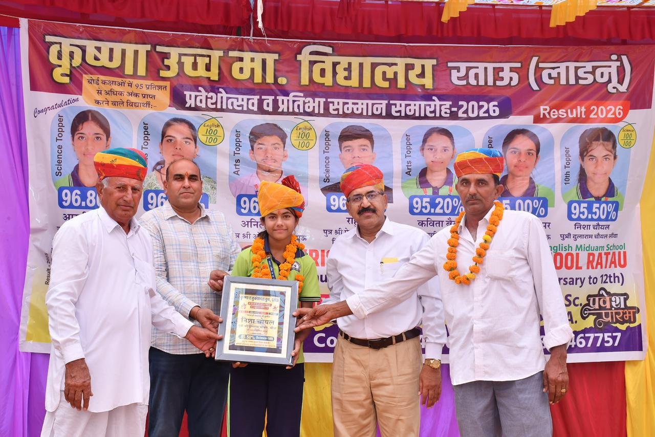 लाडनूं (नवयत्न)। तहसील के ग्राम रताऊ की कृष्णा सीनियर सैकेंडरी स्कूल में प्रवेश उत्सव एवं प्रतिभा सम्मान समारोह का आयोजन किया गया। कार्यक्रम में बोर्ड क्लास में टॉपर्स विद्यार्थियों को सम्मानित किया गया। इससे पहले बच्चों को घोड़ी पर बिठाकर के डीजे के साथ गांव में जुलूस निकाला गया। ग्रामीणों ने फूल मालाएँ पहनाकर बच्चों का जगह जगह स्वागत किया। समारोह में 90 फीसदी से ऊपर 37 बच्चों का मोमेंटो व उनके अभिभावकों का मान-सम्मान किया गया। साथ ही अपनी अपनी कक्षाओं प्रथम व द्वितीय स्थान पर रहे विद्यार्थियों का सम्मान भी किया गया। प्रतिभा सम्मान कार्यक्रम में आरती खीचड़ दूदोली 96.80 फीसदी, दीपा शेखावत राणसीसर 96. 40 फीसदी, अनिल चौधरी रताऊ 96.20 फीसदी, राहुल 96 फीसदी, कविता बेरा सिलनवाद 95.20 फीसदी, मनीषा वीडियासर रताऊ 95 फीसदी, निशा चोयल 95.50 फीसदी, प्रियंका भाकर दूधवाली 95.80 फीसदी, लक्षिता नैण खंगार 95.20 प्रतिशत व राहुल 95.20 फीसदी का विशेष सम्मान किया गया। कार्यक्रम में लाडनूं प्रधान हनुमान कासनिया, चिकित्सा विभाग के संयुक्त निदेशक संपत सिंह जोधा, संरक्षक रामसुख कासनियां बतौर अतिथि उपस्थित रहे । इससे पहले विद्यालय का वार्षिक प्रतिवेदन निदेशक जगदीश कासणियां ने प्रस्तुत किया। संचालन कृष्ण कासनिया ने किया।