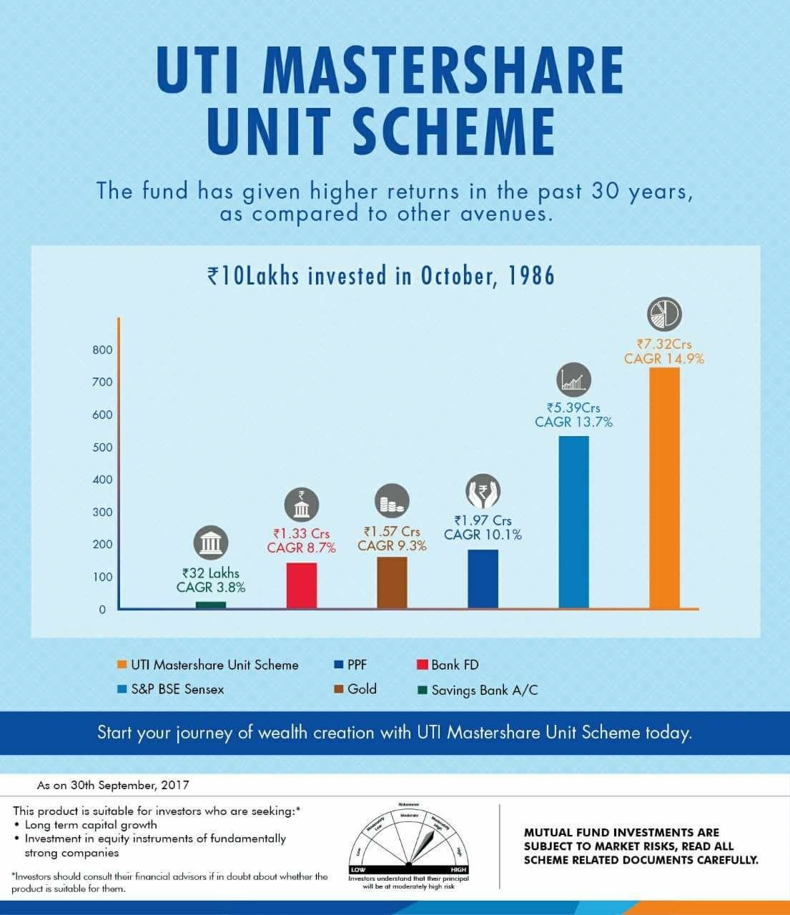 जयपुर, (बी एल)11 मई। यूटीआई मास्टरशेयर यूनिट स्कीम को भारत का पहला इक्विटी उन्मुख फंड कहा जा सकता है (इसे अक्टूबर 1986 में लॉन्च किया गया था), जिसका 30 से अधिक वर्षों तक धन निर्माण का ट्रैक रिकॉर्ड है। यूटीआई मास्टरशेयर यूनिट स्कीम, एक ओपन एंड इक्विटी स्कीम है जो मुख्य रूप से बड़े कैप स्टॉक में निवेश करती है। लार्जकैप फंड होने के दौरान, फफड स्टॉक चुनने में ग्रॉथ एंड रीजनेबल प्राइज (जीएआरपी) की निवेश शैली का पालन किया जाता है। इसका मतलब है, किसी कंपनी की कमाई में अंतर्निहित वृद्धि को देखते हुए अपने पोर्टफोलियो में उस स्टॉक को खरीदने के लिए कितना उचित मूल्य देना चाहिए।