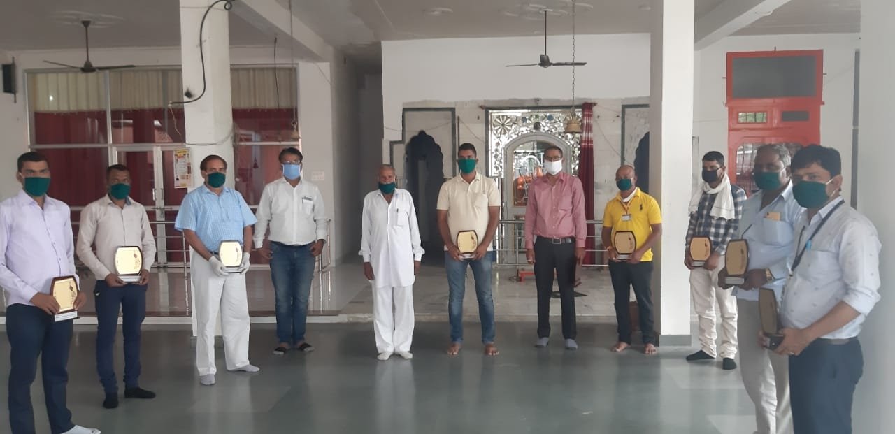 रींगस,( विद्याधर शर्मा )5 मई। कस्बे की स्थानीय सीटी बस स्टैंड सेवा समिति द्वारा लाॅक डाउन के दौरान भी अपने कर्तव्य का निर्वहन करने वाले विद्युत विभाग के कर्मवीर योद्धाओं का स्वागत एवं सम्मान किया। कार्यक्रम का आयोजन पावर हाउस वाले बालाजी महाराज मंदिर प्रांगण में सोशल डिस्टेंस रखते हुए सभी अधिकारियों एवं कर्मचारियों का सम्मान किया गया। इस अवसर पर समिति के अध्यक्ष निरंजन शर्मा ने कहा कि देश में चल रहे लाॅक डाउन की इस विकट परिस्थिति में भी कस्बे की महत्वपूर्ण जिम्मेदारी निभा रहे कर्मवीर योद्धा के असली हकदार है। वरिष्ठ सदस्य पार्षद अखिलेश भातरा ने कहा कि समिति द्वारा सभी कर्मवीर युद्धाओ का सम्मान करते हुए हर्ष महसूस कर रही है। पार्षद प्रतिनिधि राकेश भादूपोता ने समिति के किए गए सामाजिक कार्यों के बारे में बताते हुए कहा कि समिति लगातार करीबन 40 दिन से जरूरतमंद लोगों को सुखी राहत सामग्री पहुंचाने का कार्य कर रही है जिसमें सभी कार्यकर्ता तन मन धन से लगे हुए हैं। भामाशाहों के सहयोग लेकर यह समिति आज भी जरूरतमंद लोगों को राशन पहुंचाने का कार्य कर रही है। समिति के उपाध्यक्ष हरिप्रसाद बलौदा ने बताया कि विद्युत विभाग के कर्मचारी व अधिकारी दिन रात इस वैश्विक महामारी में भी अपना फर्ज अदा कर रहे हैं। सहायक अभियंता उमेद सिंह ने कहा कि किसी भी विकट परिस्थिति में हमारे विभाग के कर्मचारियों के कार्य की जिम्मेवारी दुगनी हो जाती है और घर परिवार की परवाह किए बगैर लोगों की सेवा करना ही मुख्य धैय्य है। इस दौरान सिटी बस स्टैंड सेवा समिति ने करीब एक दर्जन से भी ज्यादा अधिकारियों व कर्मचारियों का स्वागत किया गया। विद्युत तकनीशियन यूनियन के जिलाध्यक्ष दिलीप झाला ने समिति के कार्यों की सराहना करते हुए लोगों से जुड़ कर जरूरतमंद लोगों को राहत सामग्री पहुंचाना प्रमुख कार्य कर रही है हमारी यूनियन ऐसी भामाशाह समितियों का सलाम करती है। इस अवसर पर कनिष्ठ अभियंता राकेश महला, कनिष्ठ अभियंता निर्लेश यादव, पार्षद अशोक कुमावत, अमित शर्मा, श्री सूर्य मंडल समाज सेवा समिति के सदस्य सलीम कायमखानी, घनश्याम कुमावत, कमल कुमार साबू, श्रवण कुमार सैन, संदीप किसनाका सहित अनेक लोग उपस्थित रहे। इसके साथ ही समिति द्वारा चलाए जा रहे लेमन टी पिलाने की भी प्रशंसा की। समिति विकट परिस्थिति में तमाम सरकारी कार्यालयों व जयपुर- सीकर बॉर्डर पर पुलिसकर्मियों को घासी राम कुमावत व बनवारीलाल कुमावत दोनों लेमन टी पिलाकर सबका मनोबल बढ़ा रहे हैं।